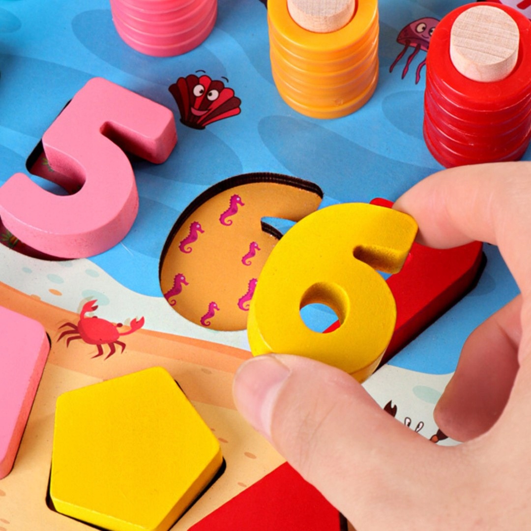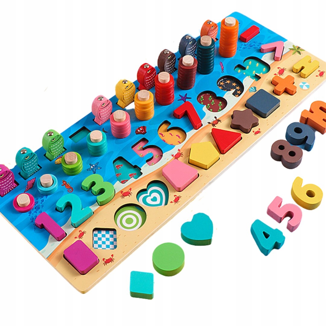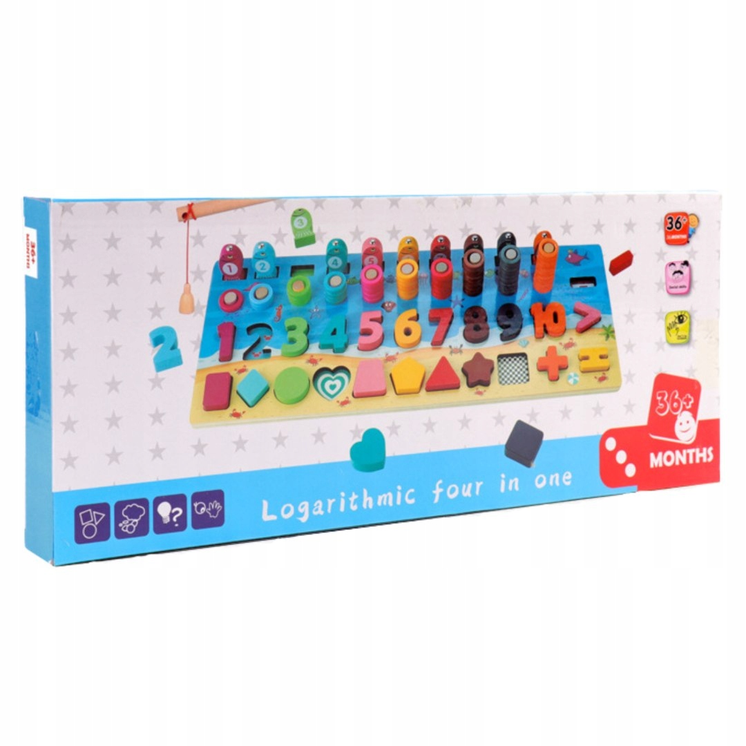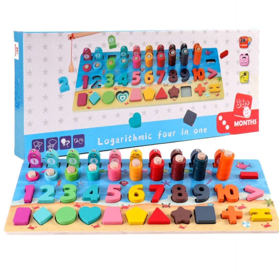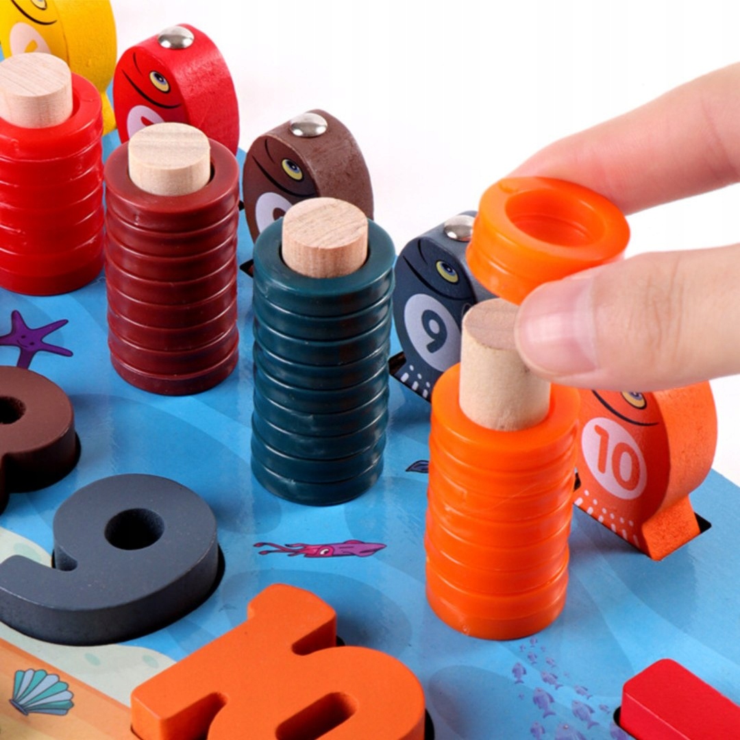 DREWNIANA UKŁADANKA NAUKA LICZB CYFEREK MONTESSORI ŁOWIENIE RYBEK STOŻKI