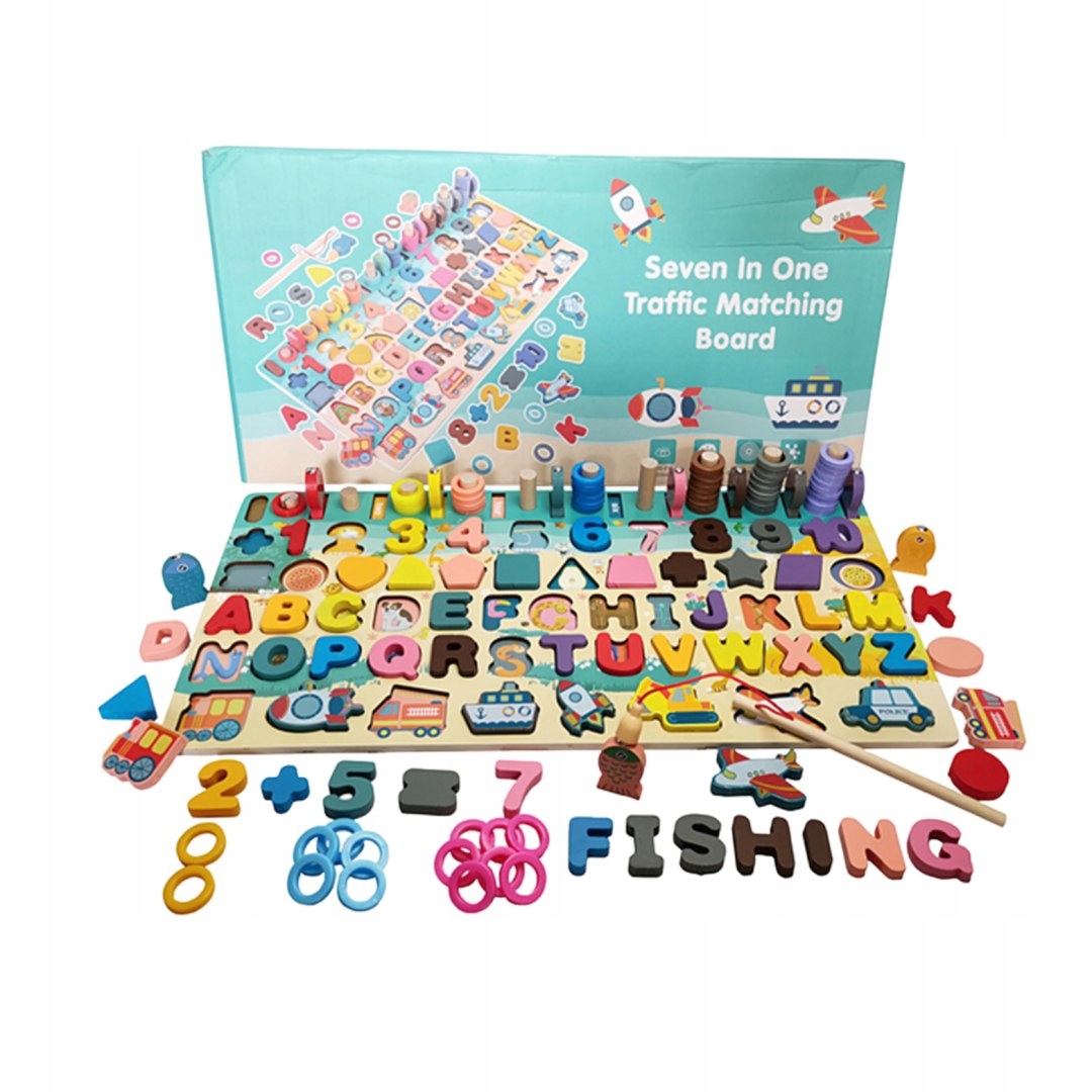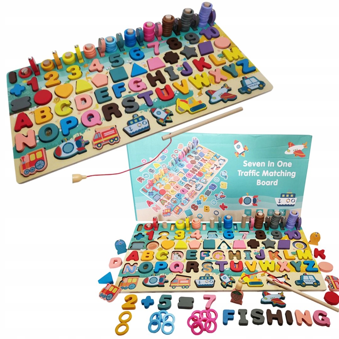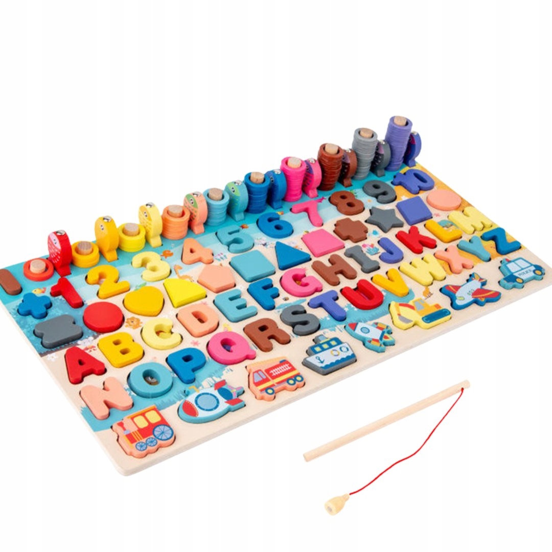 Zabawka zawiera puzzle z różnymi kształtami, które dziecko dopasowuje do odpowiednich otworów. To rozwija zdolności logicznego myślenia i naukę rozpoznawania kształtów. Dziecko staje się małym rybakiem, próbując złapać kolorowe drewniane rybki za pomocą wędki. Zestaw łączy w sobie naukę alfabetu, cyfr, kształtów oraz umiejętności motoryczne.