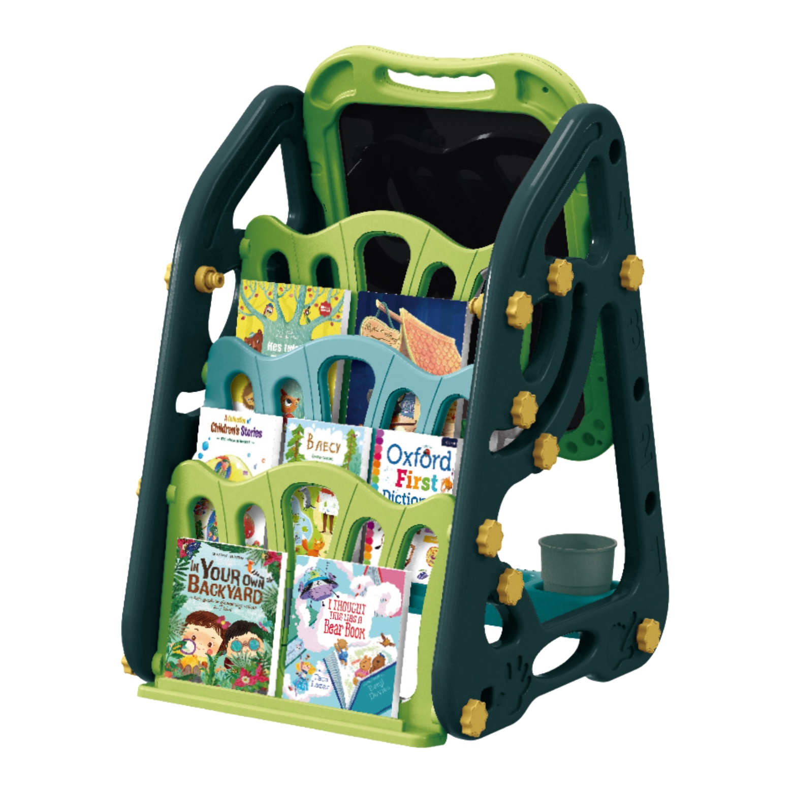 Dolna część sztalugi to wygodna półka, na której można umieścić różne artykuły papiernicze i rysunkowe, takie jak farby, kredy, pisaki i wiele innych. To uczy dzieci organizacji i dbania o swoje rzeczy. Z drugiej strony znajdują się trzy miejsca do wygodnego przechowywania albumów i notatników.