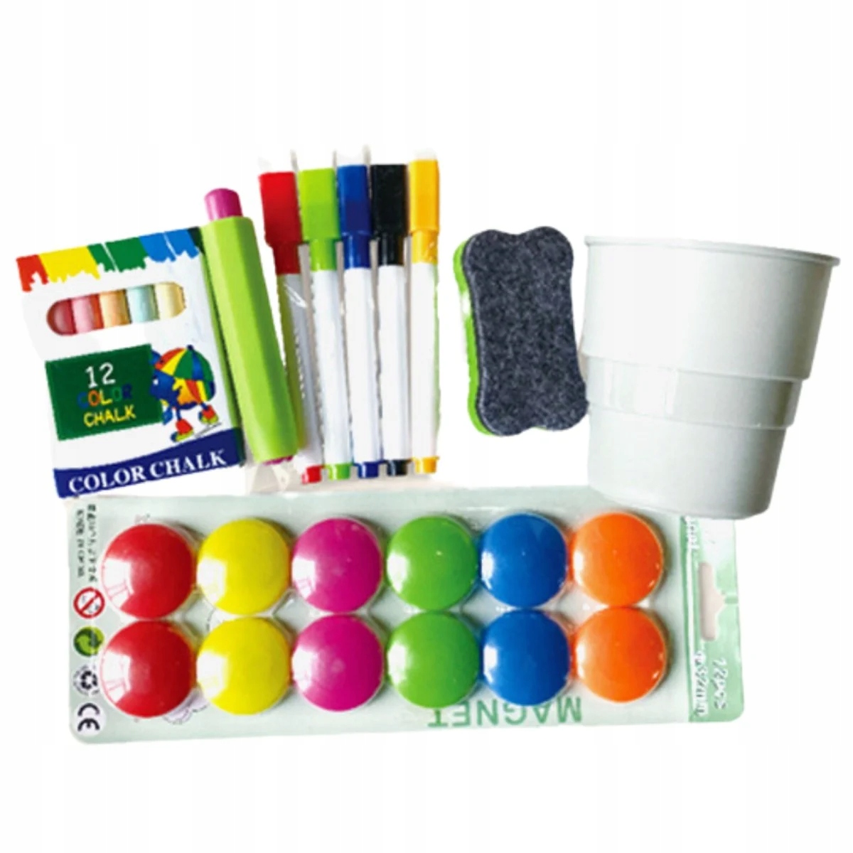 ? W zestawie: tablica dwustronna, krzesełko, magnesy, markery, kredy, gąbka do zmazywania