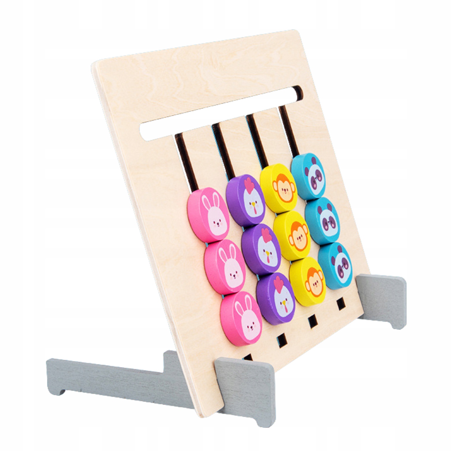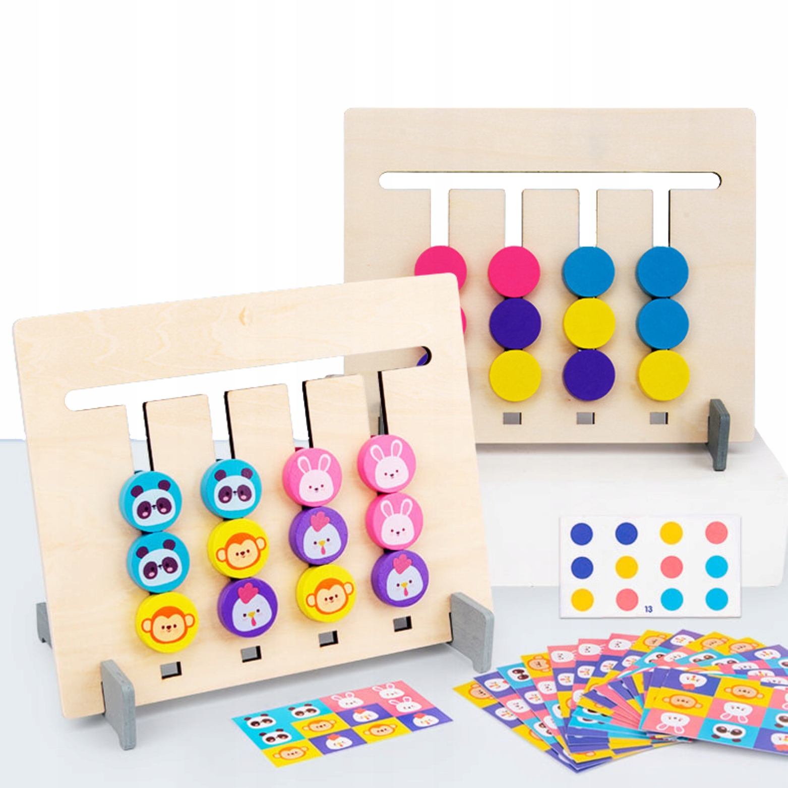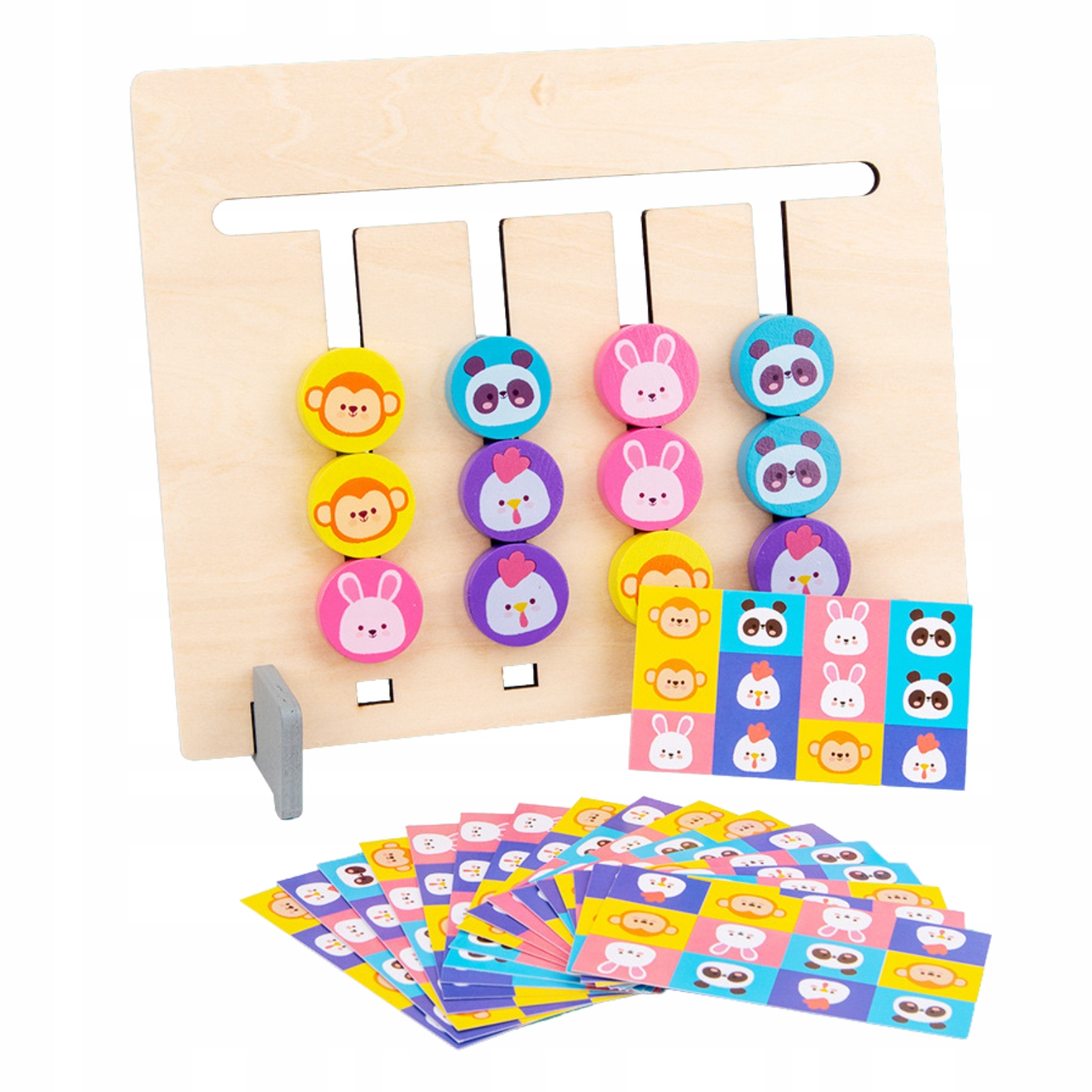 Zestaw zawiera kolorowe klocki z dwóch stron. Pierwsza strona ozdobiona jest uroczymi zwierzątkami, które dodają grze atrakcyjności, a druga – czysta, ułatwiająca pierwsze próby nauki kolorów. Dzięki temu ta gra edukacyjna jest odpowiednia dla dzieci w różnym wieku i pozwala stopniowo rozwijać kolejne umiejętności.