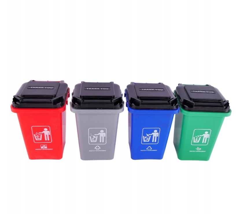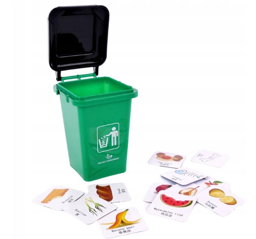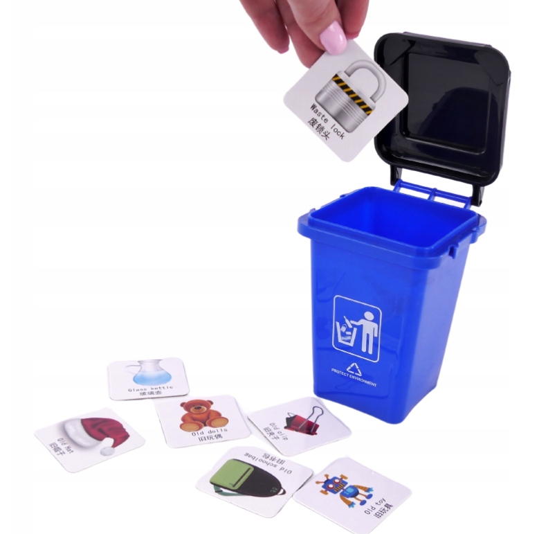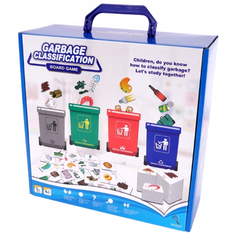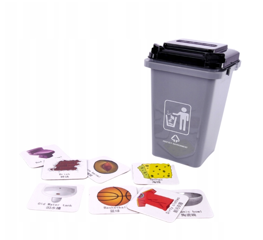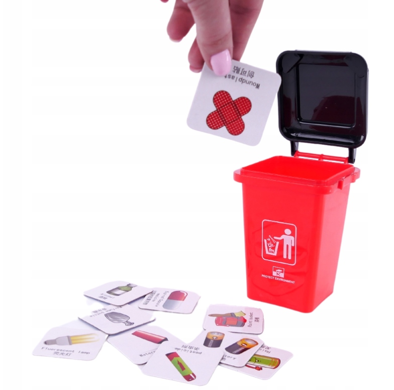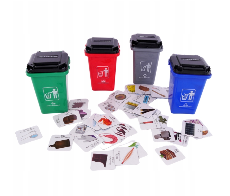 Dodatkowo w zestawie znajdziemy również kubły na śmieci o różnych kolorach, odpowiadające wzorom na kartach. Gracze muszą teraz dopasować odpowiednie karty do kubłów na śmieci, tak aby każdy rodzaj odpadu trafił do właściwego pojemnika!