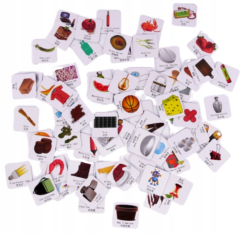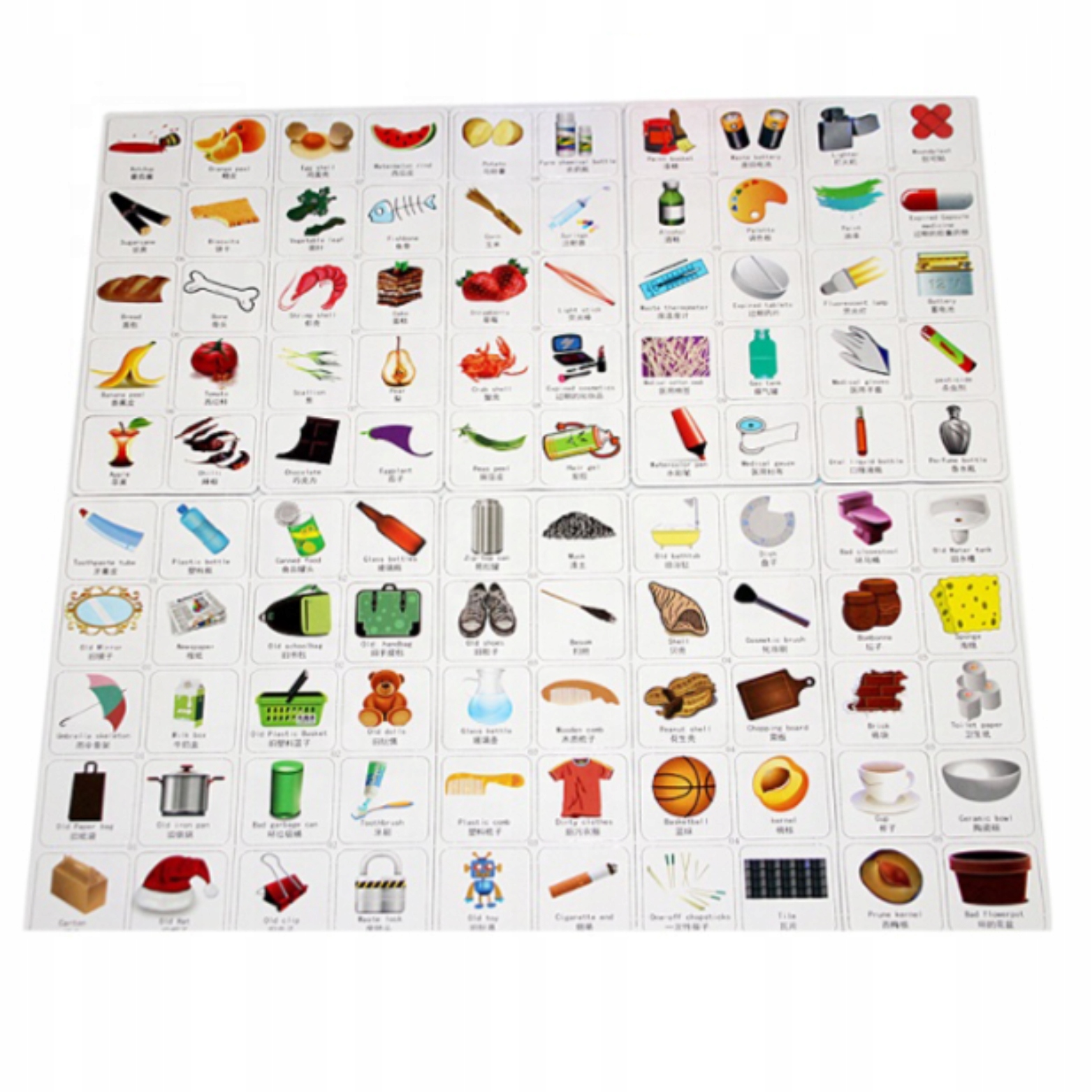 Zestaw gry zawiera karty, na których znajdują się obrazki przedstawiające różne rodzaje odpadów, takie jak plastikowe butelki, papier, szkło, metal, itp. Każdy rodzaj śmieci jest reprezentowany przez inny kolor lub wzór na karcie, co ułatwia identyfikację.