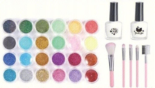 ? Zawartość zestawu: 24 brokaty, 2 kleje, 5 pędzelków, 3 arkusze wzorów, 120 szablonów