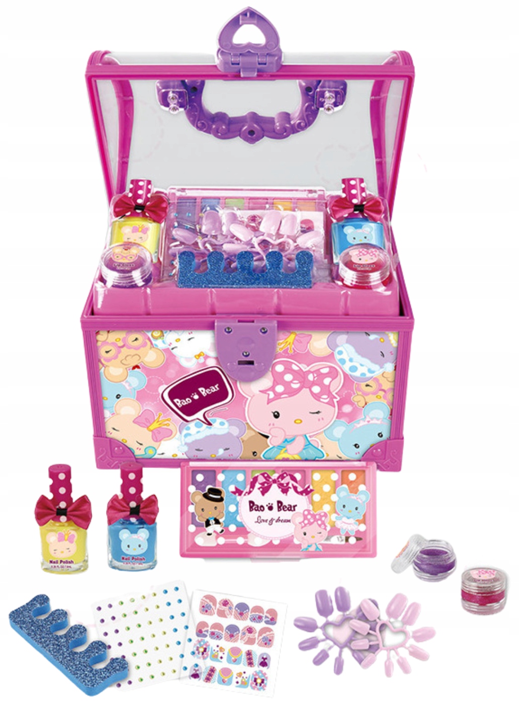 Ten piękny kufer zawiera lakiery do paznokci, które pozwolą Twojemu dziecku tworzyć niepowtarzalne stylizacje z różnymi kolorami i wzorami na paznokciach. Dzięki różnym odcieniom i efektom, Twoje dziecko będzie mogło dopasować swój manicure do różnych okazji i nastrojów.