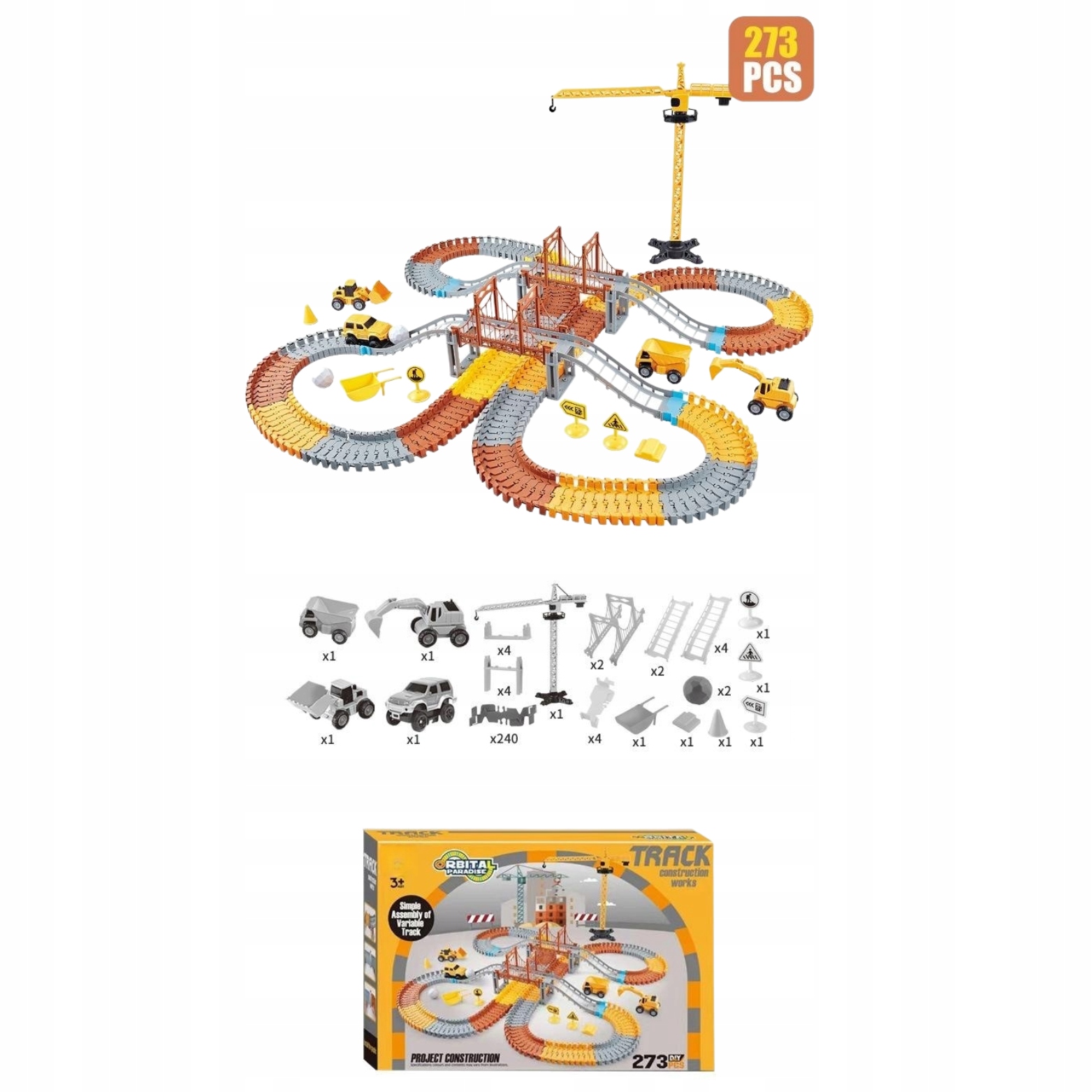- Zawartość zestawu: Elastyczne elementy toru, 1 elektryczny samochodzik, 3 samochodziki budowlane, Znaki drogowe, Wisząca wieża, Mosty, Inne akcesoria,
