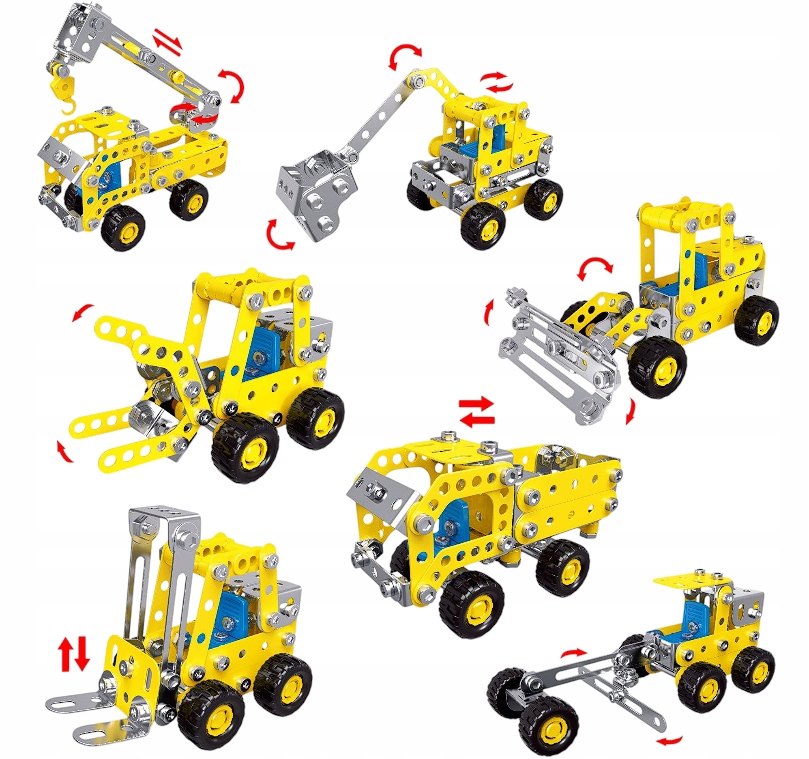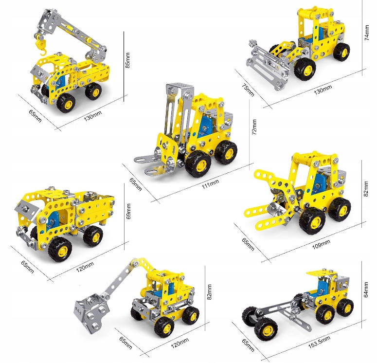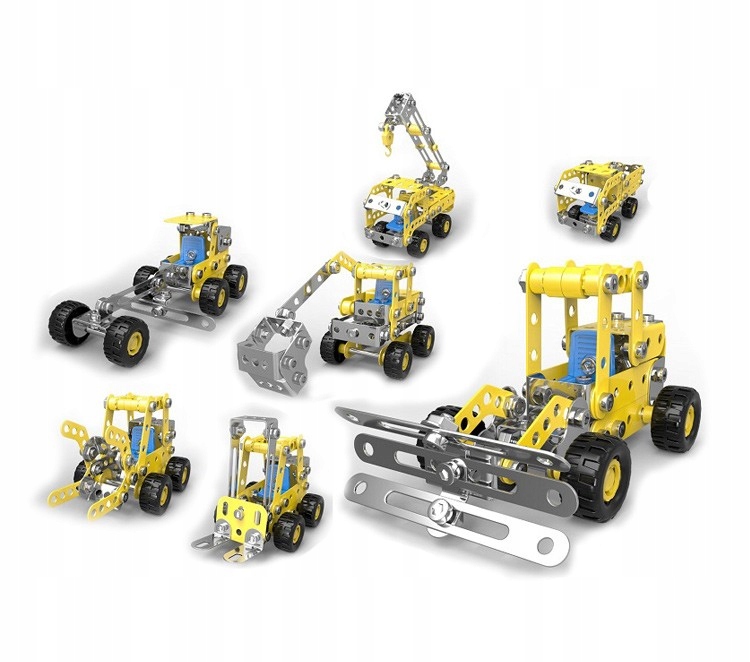 Metalowe Klocki Konstrukcyjne 7 Pojazdów Maszyny Budowlane Blaszki 180el