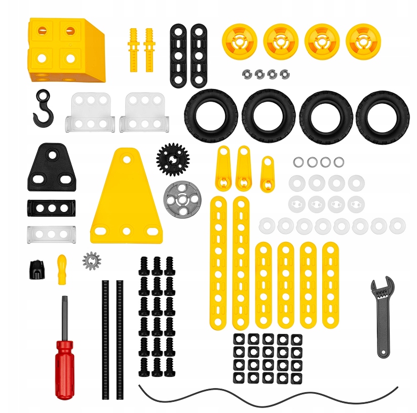 ✓ Aż 100 Elementów – Bogaty zestaw pozwalający na budowę 8 różnych maszyn budowlanych (np. dźwigu, spychacza, koparki).