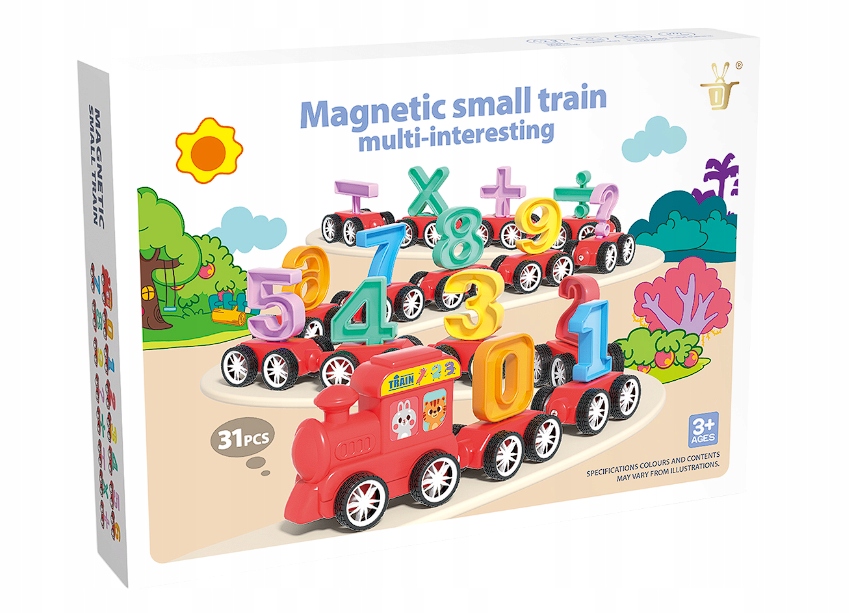✅ 31 elementów – lokomotywa plus 30 wagoników z cyframi i symbolami matematycznymi