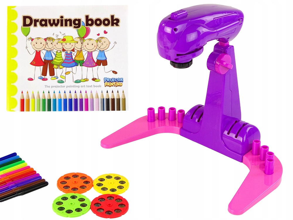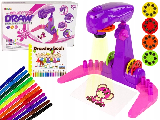 - Zawartość zestawu: Projektor z podstawką do rysowania i malowania, 4 krążki z obrazkami, 12 pisaków, 32 przykładowe wzory do rysowania