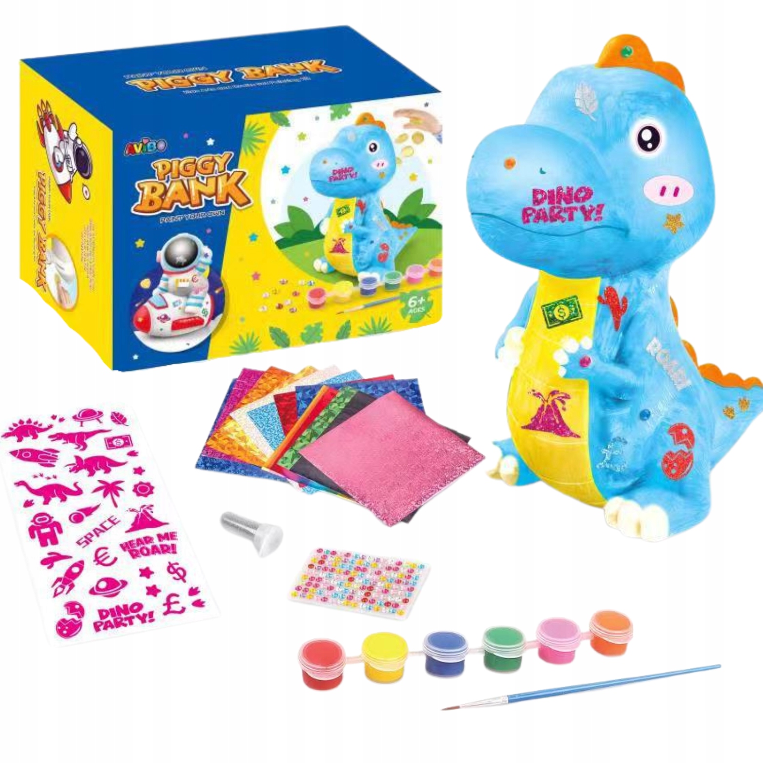 - Zawartość zestawu: Skarbonka w kształcie dinozaura, Farby do malowania, Pędzel, Naklejki, Diamenciki, Kolorowe folie, Brokat.