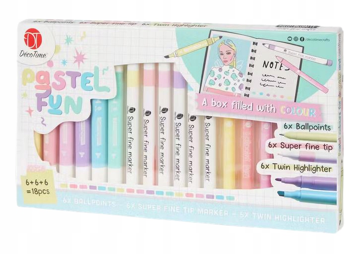 Zestaw zawiera 6 długopisów, 6 zakreślaczy i 6 markerów, które umożliwiają tworzenie pięknych i kolorowych tekstów, notatek, rysunków i innych dzieł.