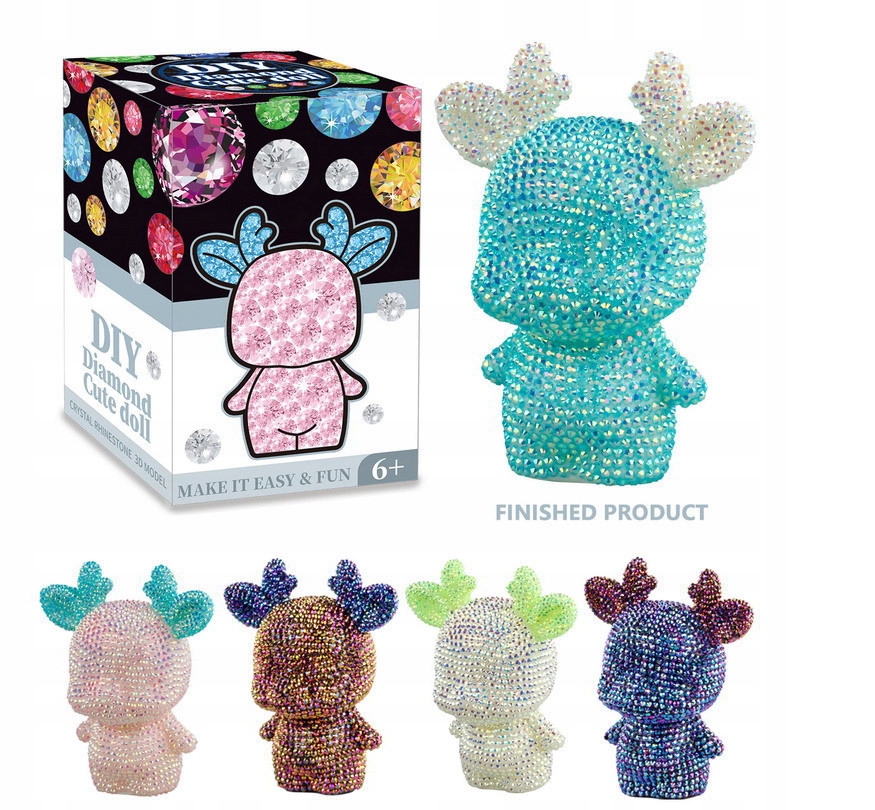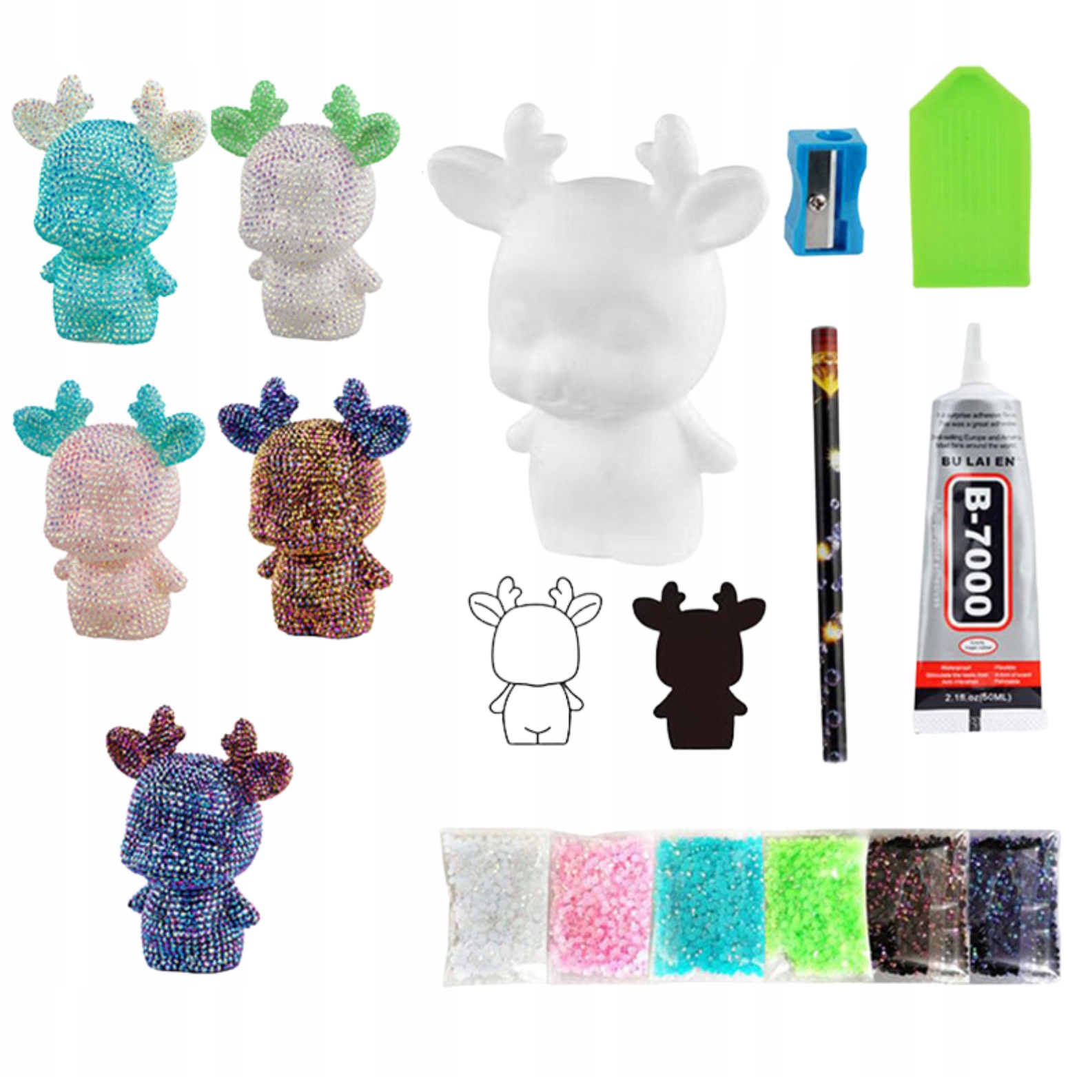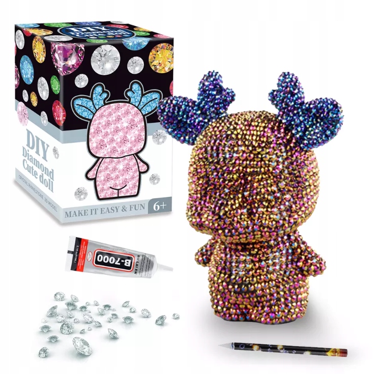 W zestawie znajduje się figurka jelonka, która stanowi bazę do wyklejania kryształkami.