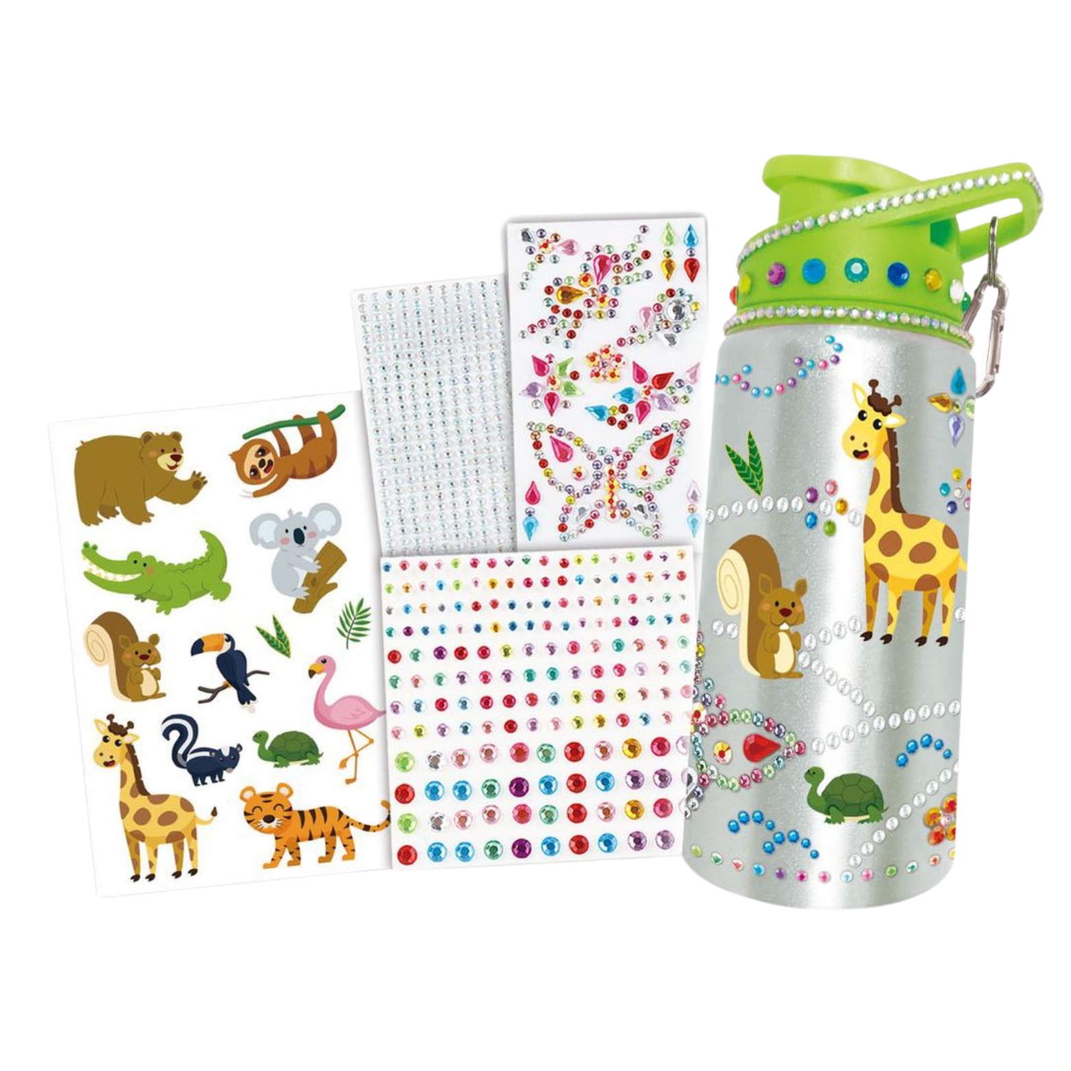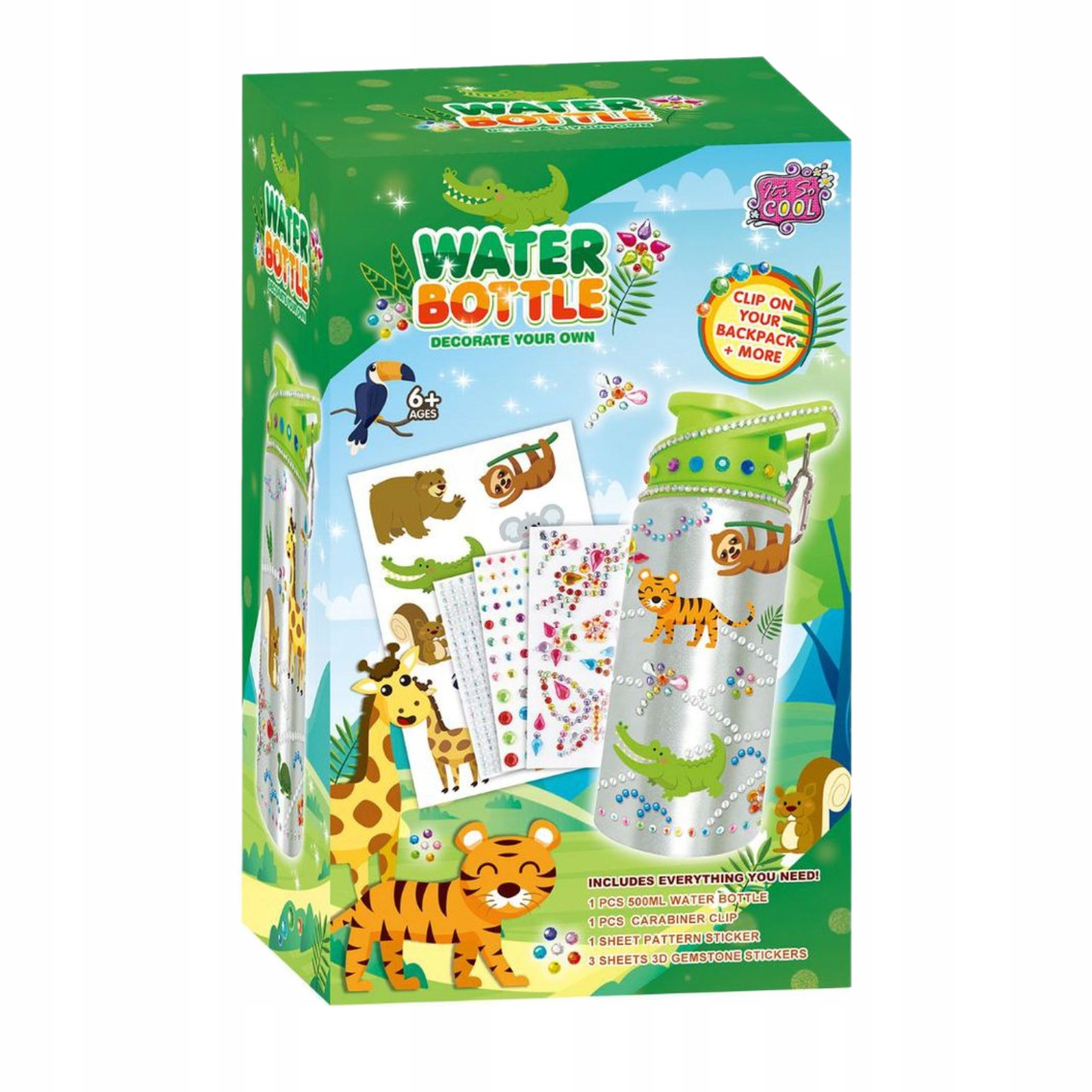 Zestaw zawiera butelkę na wodę, naklejki oraz diamenciki. Wystarczy oderwać naklejkę z wybranym wzorem i przykleić do butelki. Dzięki temu dzieci mają szansę na tworzenie różnorodnych kompozycji, układając wybrane wzory.