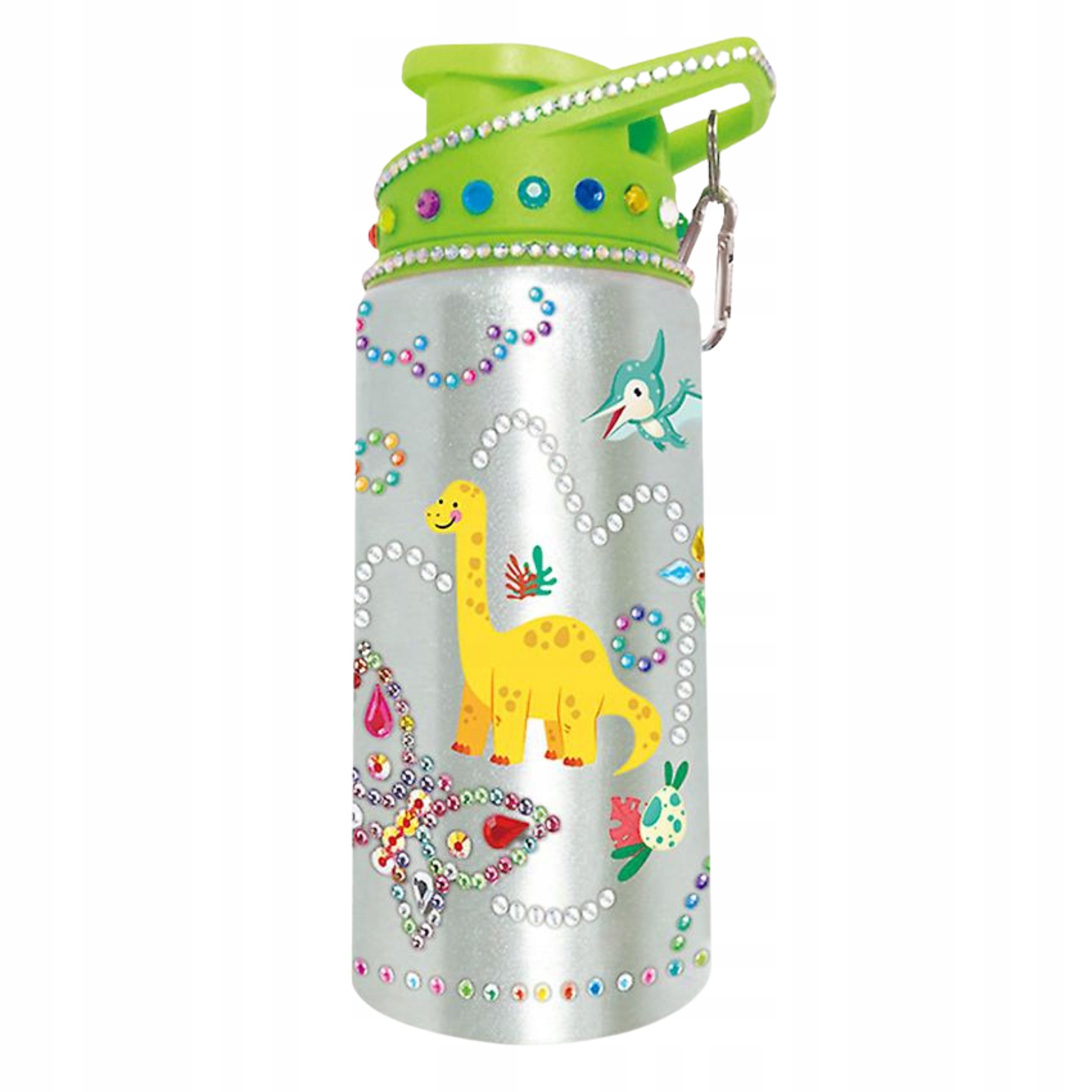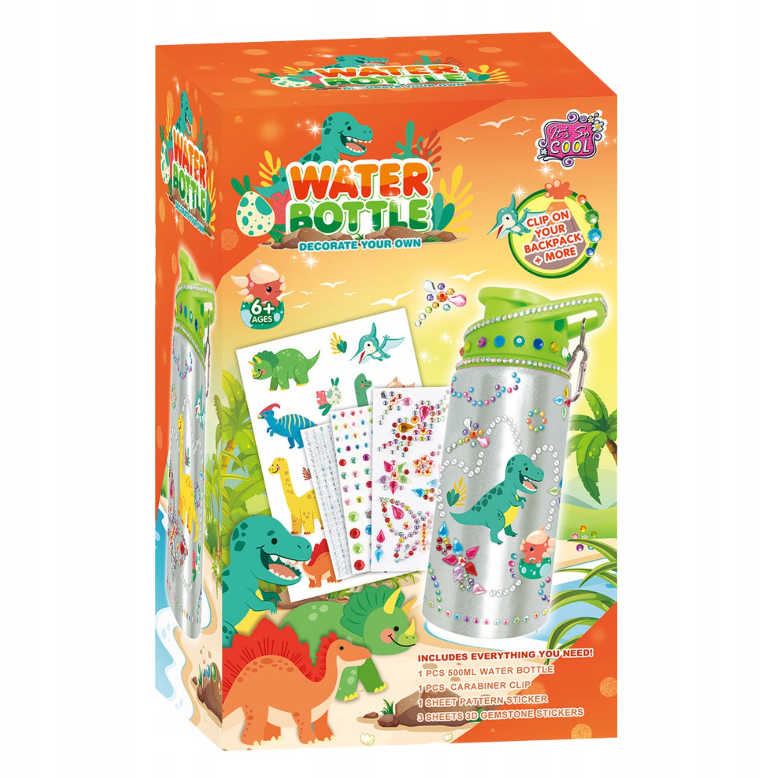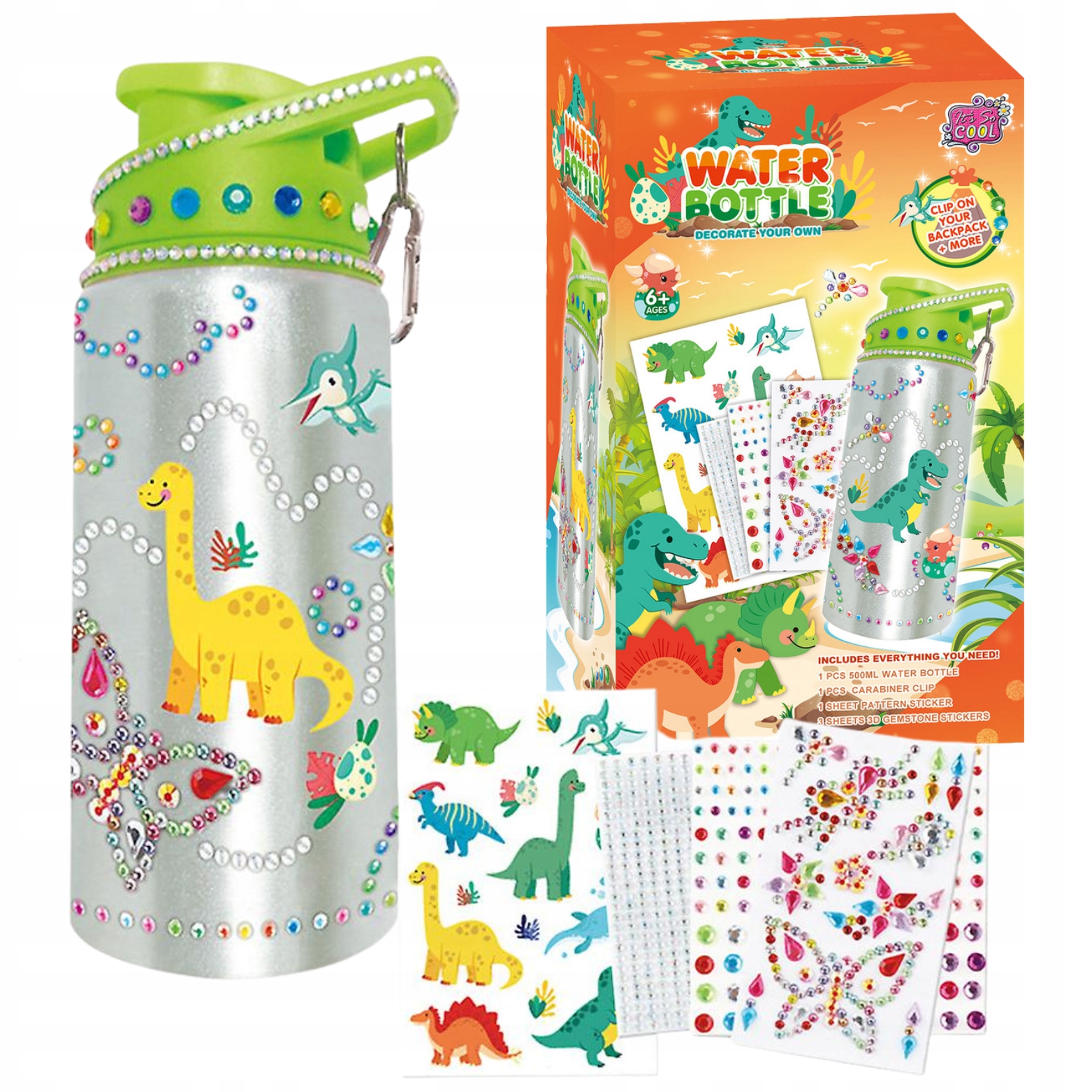 Zestaw zawiera butelkę na wodę, naklejki oraz diamenciki. Wystarczy oderwać naklejkę z wybranym wzorem i przykleić do butelki. Dzięki temu dzieci mają szansę na tworzenie różnorodnych kompozycji, układając wybrane wzory.