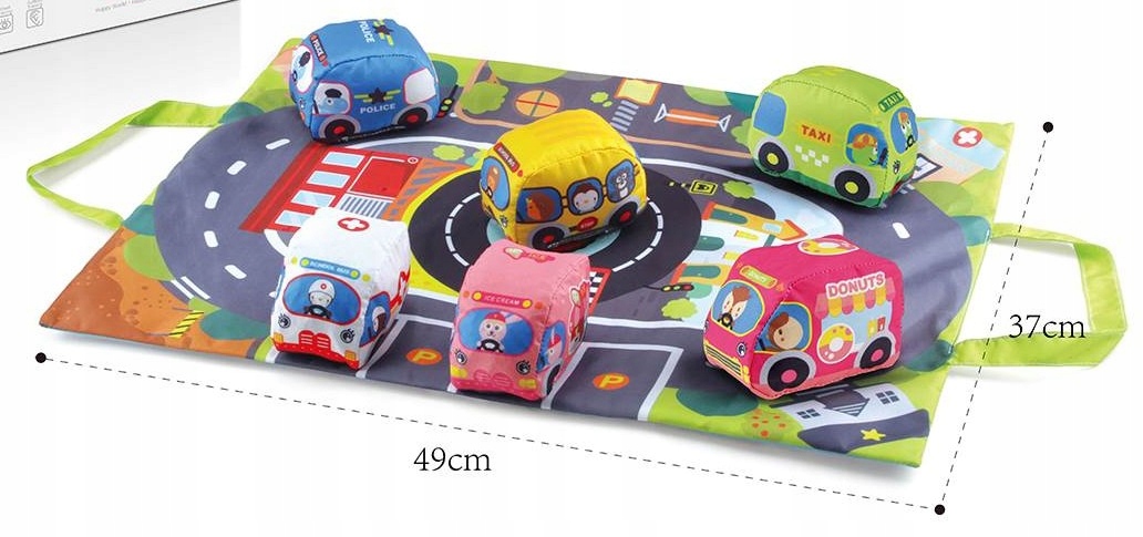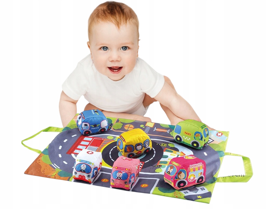 ? Zawartość zestawu: 6 miękkich autek + mata z motywem miasta