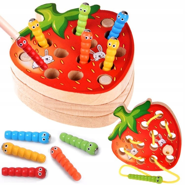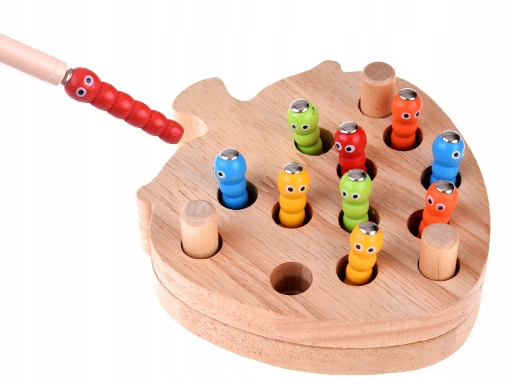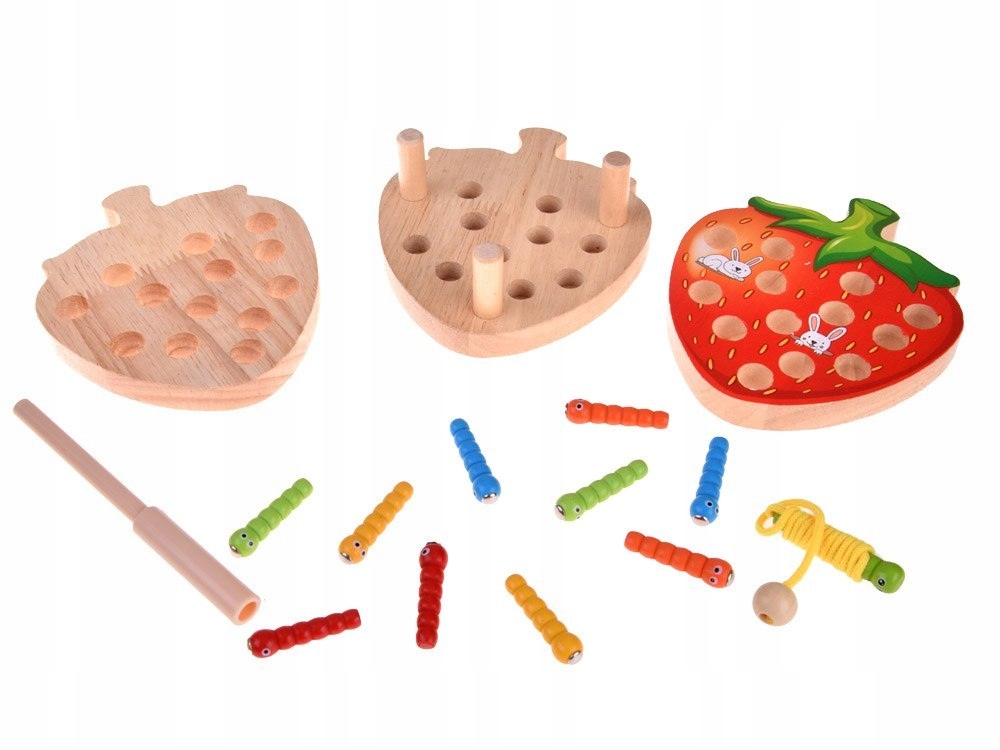 ZŁAP ROBACZKA GRA ZRĘCZNOŚCIOWA LOGICZNA MAGNES TRUSKAWKA DREWNIANA 2W1
