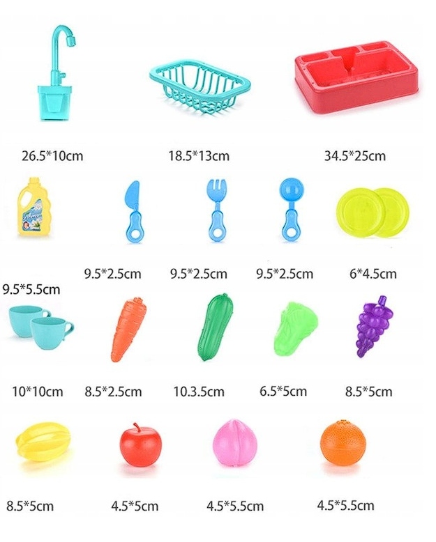 ✅ Bogaty zestaw akcesoriów – 16 elementów, w tym naczynia, sztućce, butelka z „płynem do mycia” i świeże warzywa i owoce.